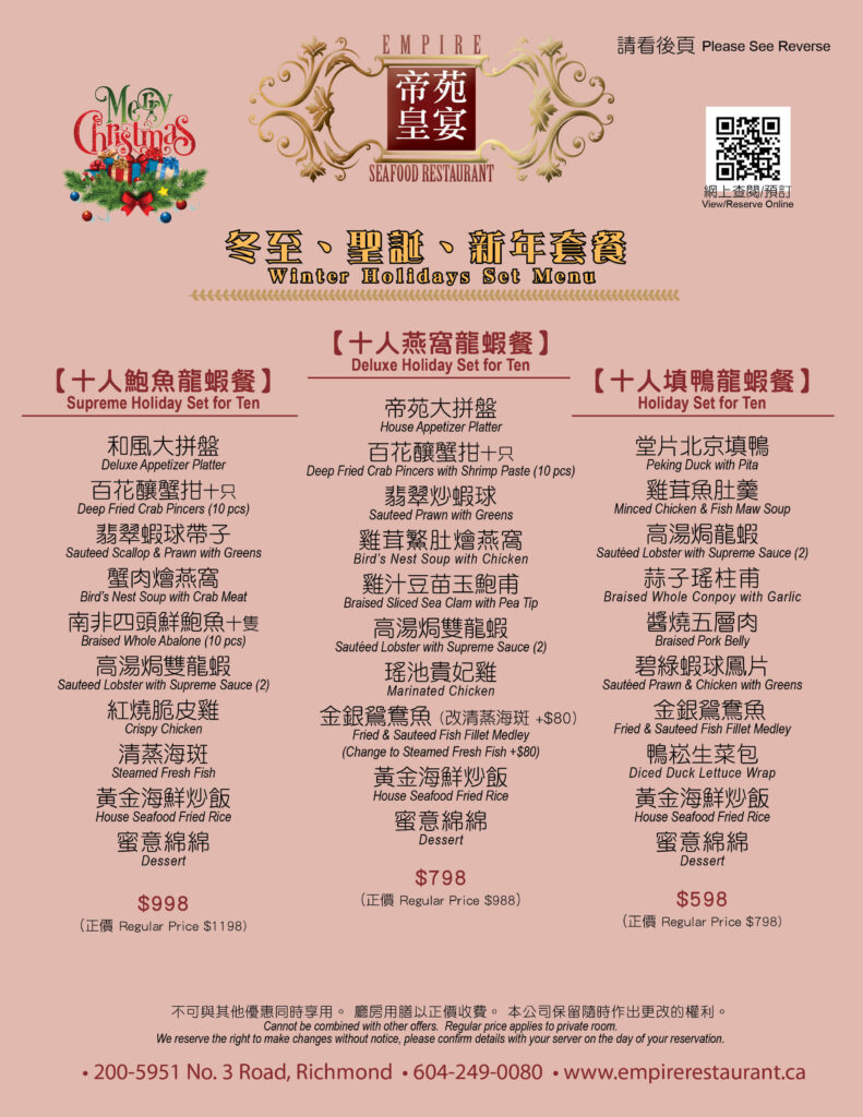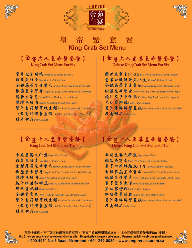 In celebration the Canadian lobster festival, Empire Seafood Restaurant has created preset dinner menus with fresh lobster at special prices. Please come and taste the unique flavor of live lobster cooked deliciously, Cantonese style.